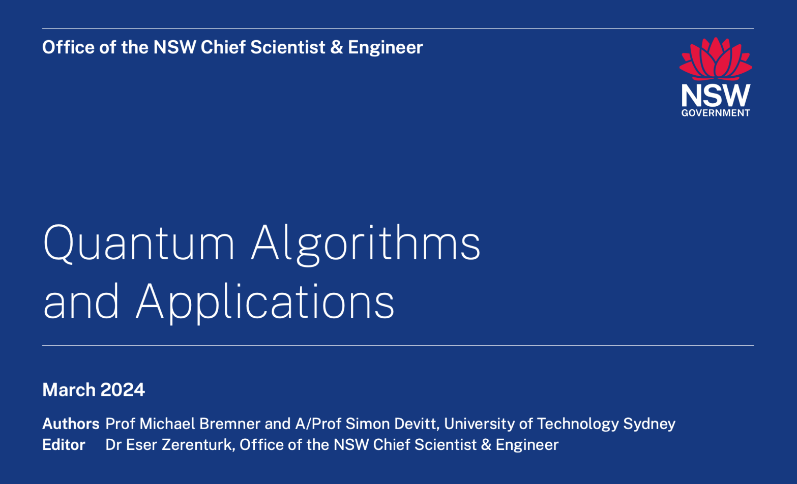 The Quantum Algorithms and Applications Study, commissioned by the Office of the NSW Chief Scientist & Engineer and authored by Professor Michael Bremner and Associate Professor Simon Devitt from the University of Technology Sydney, explores the potential impact of quantum computing on NSW.